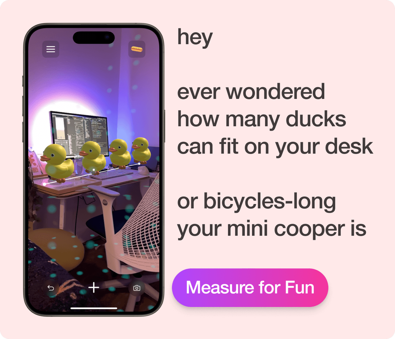 A key iteration emerged from playtests: users wanted a subtle dot grid overlay to visualize detected surfaces, giving them confidence about where and what they were measuring. We also discovered that AR performance varied noticeably by device — LiDAR-enabled phones measured from greater distances and handled challenging surfaces like metallic objects more reliably.