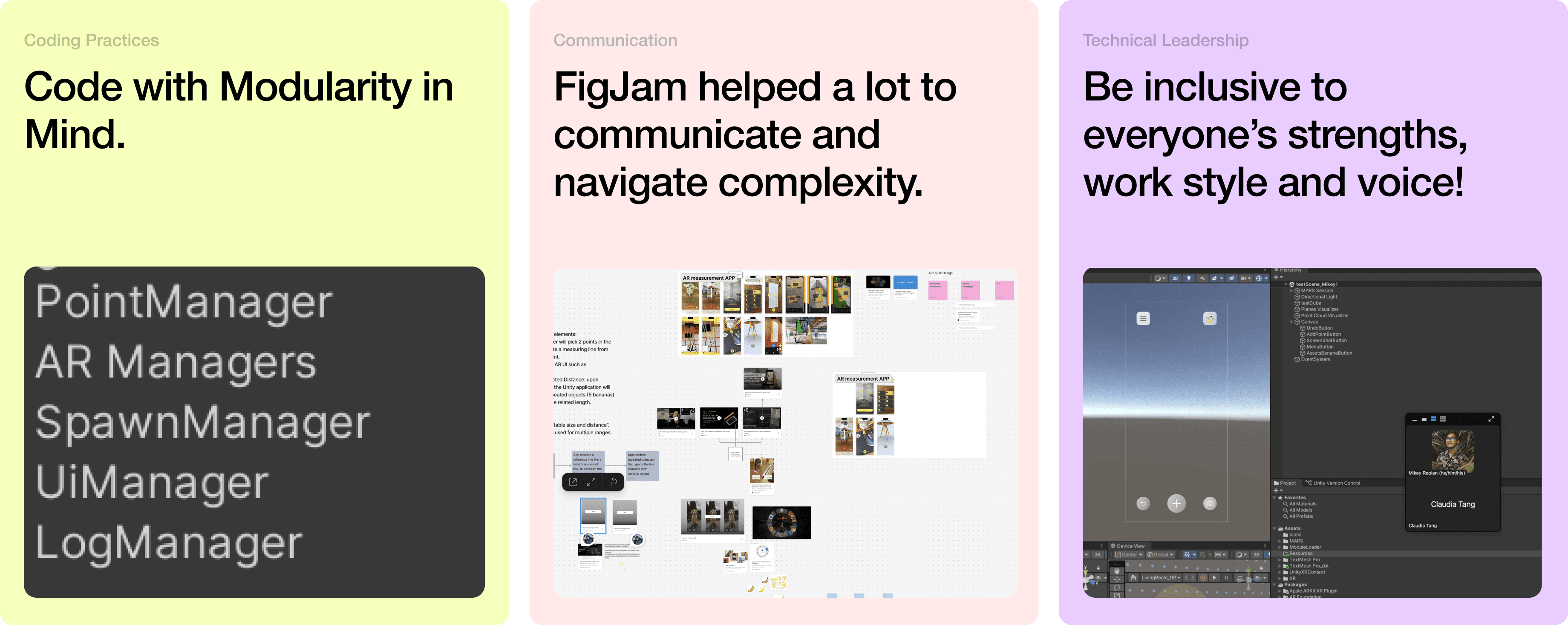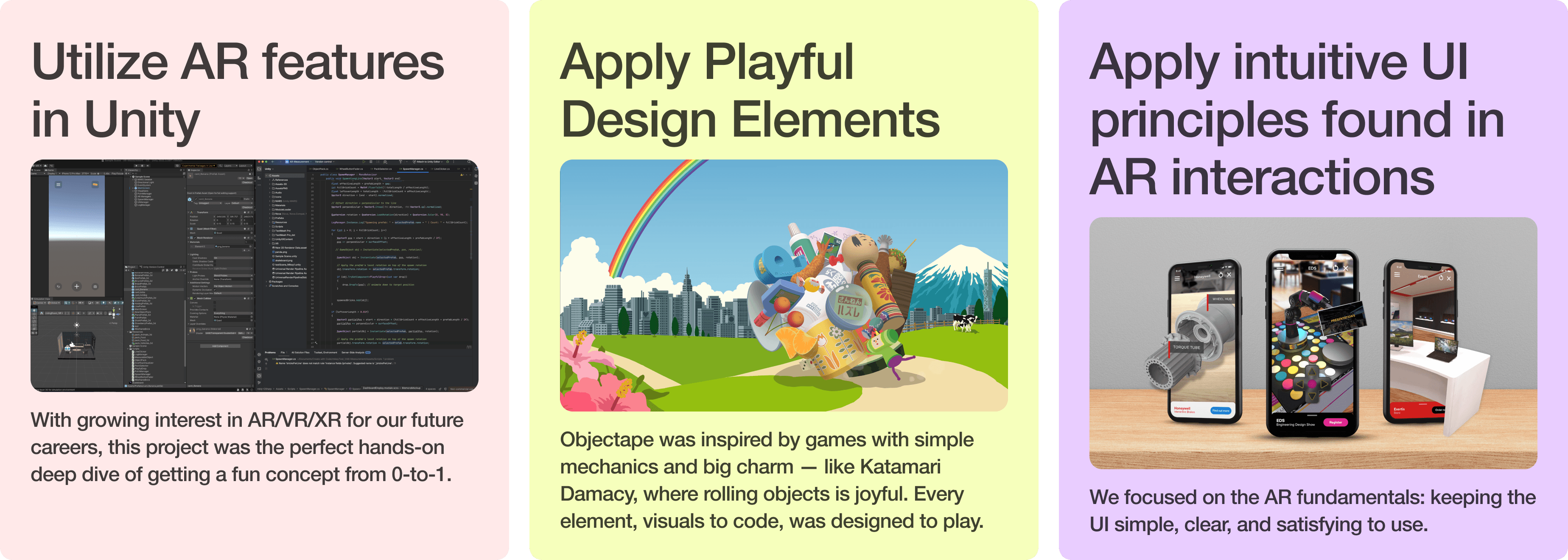 From Claudia's perspective, she noted how "playful design" may sometimes include lots of visual, colorful elements but since we wanted to keep the AR experience less cluttered, so minimalist visual design was applied and respected. We both agreed that Unity's version control system was incredibly helpful in being able to fold in updates asynchronously.