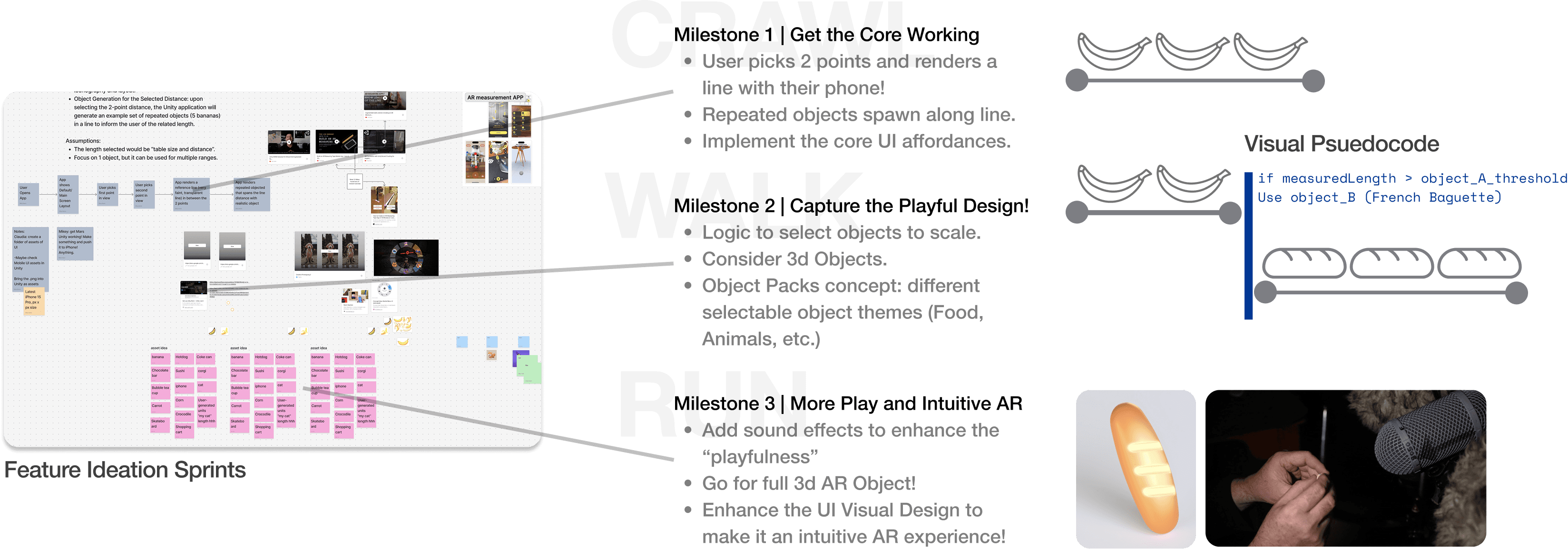 We had to be realistic! We were juggling other classes and learning AR Foundations in Unity. Milestones were designed to be achievable and incremental in features we wanted. Therefore our project management sequence was a Crawl-Walk-Run phased approach.