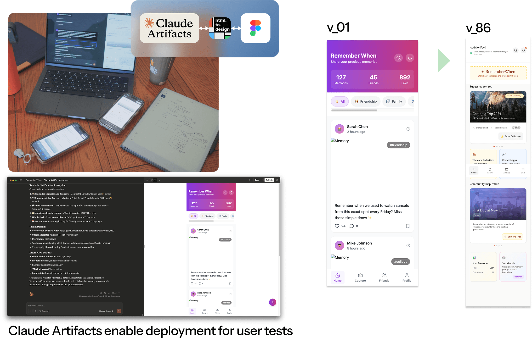 The speed was transformative. I went from v1 to v86 over the course of the project. And because the prototypes were functional and deployable via URL, I could put RememberWhen directly on users' devices during testing sessions. This enabled something I love doing: sitting alongside users and deeply listening to their feedback while adjusting the prototype in real time. Vibe-coding closed the feedback loop faster than any workflow I've used before.