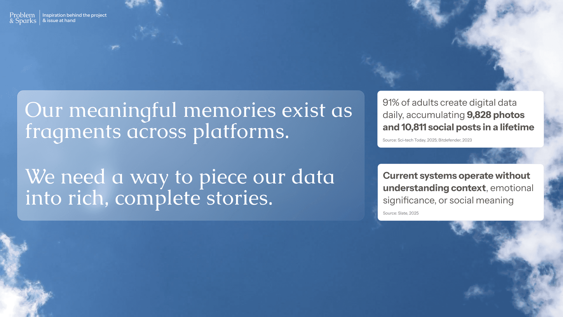 Emotion in data matters. Coming from a data science background where objectivity is the standard, this project revealed how our data still holds emotions and how design must have space to honor that. It's a memory storage capacity problem, sure. But it's also about how data can make us feel based on how it's presented. RememberWhen's visual design went through multiple iterations to invoke calm, serenity, and acceptance, visible even in the gentle sky backgrounds of the presentation deck.