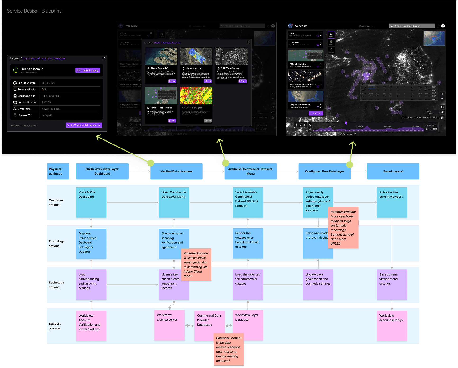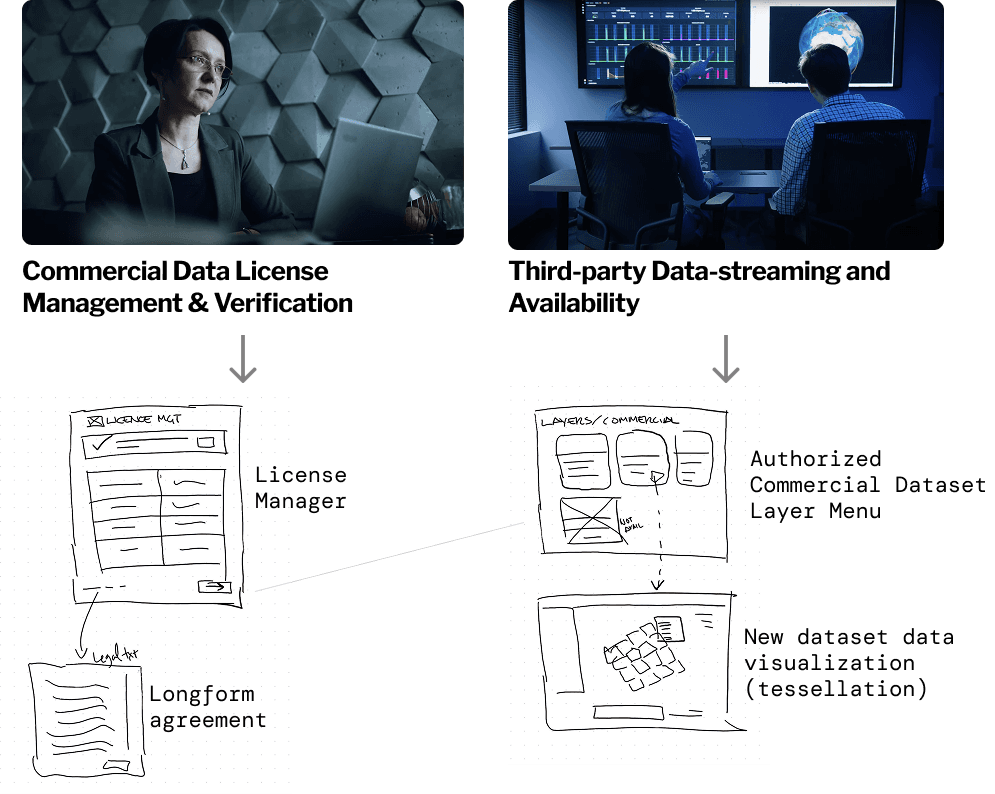 Designing this integration required thinking beyond UI. I developed a service design blueprint that identified new backstage players and touchpoints: commercial data license management and verification, authorized dataset layer menus, new data visualization formats for vector tessellation, and third-party data streaming availability.