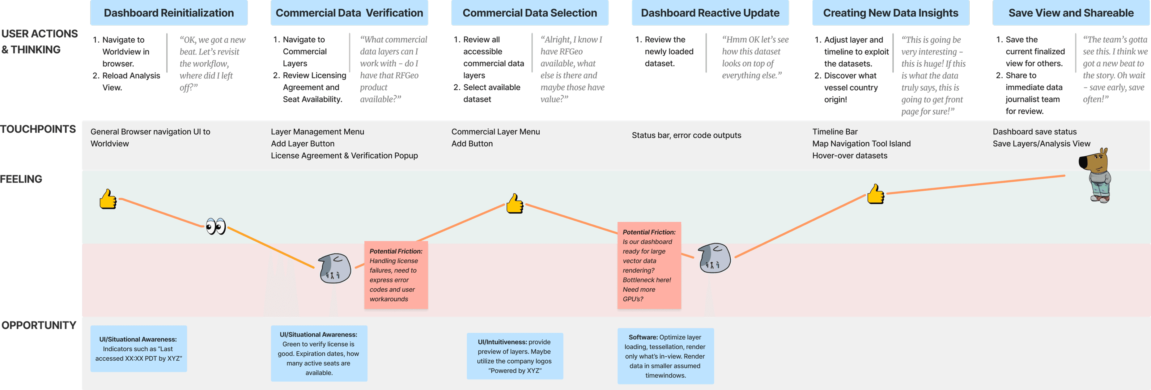 A user journey map captured Mikayla's updated mental model for working with the new data source. Friction points revealed concrete opportunities to improve touchpoint designs: situational awareness indicators like "Last accessed XX:XX PDT by XYZ," green verification states for active licenses, preview capabilities for unfamiliar commercial layers, and optimized rendering for large vector datasets.