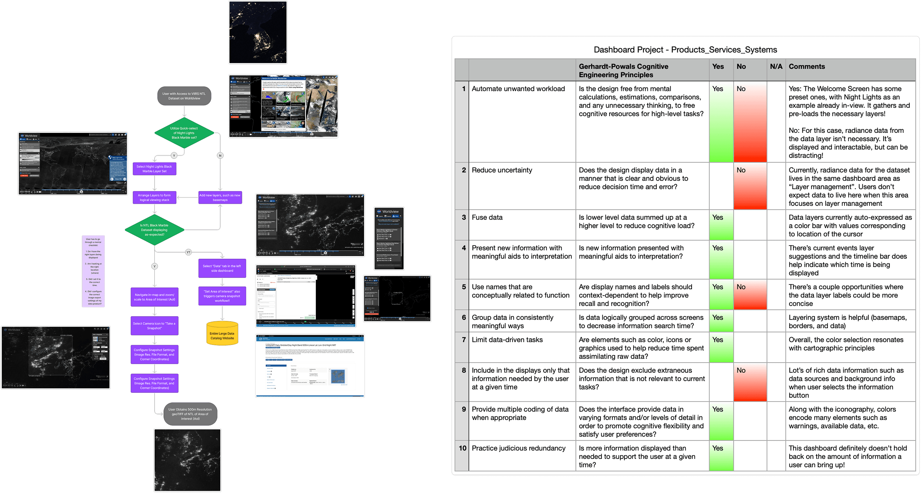 Phase 1 of the semester also included time to evaluate the existing NASA Worldview Dashboard with peers in the class. A Cognitive Task Analysis (CTA) was practiced, where I was able to observe others (3 of my non-GIS-experienced classmates) attempt basic tasks such as map layering and data export while also using a think-aloud protocol where the participants verbalized their thoughts while performing a task. Testing also included 2 data journalists from my network as well as 2 data scientists that have moderate proficiency using GIS tools like Worldview.