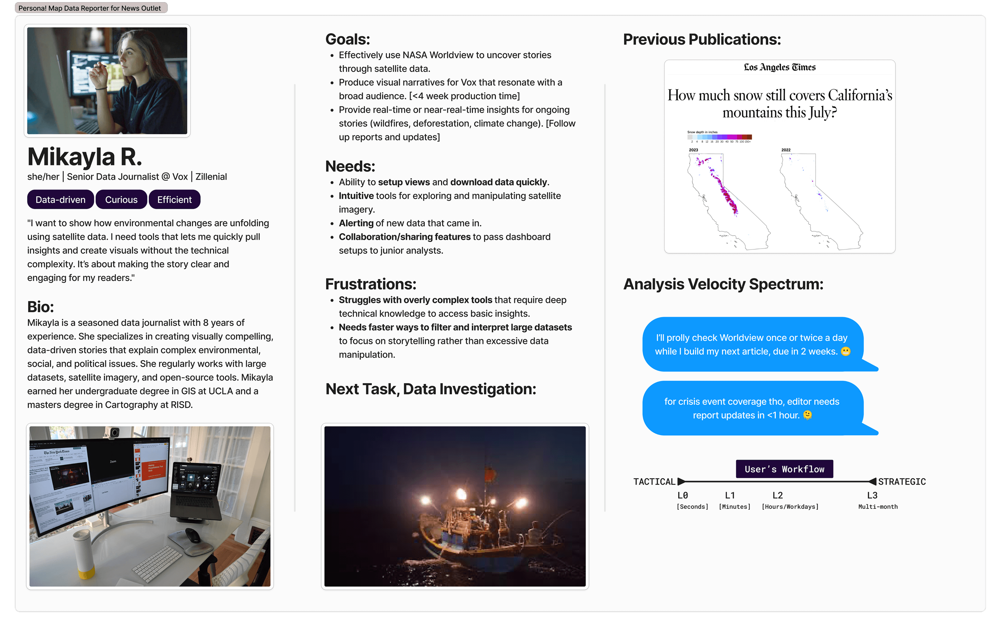 The research findings crystallized into a persona that would drive the entire project. Mikayla R. is a seasoned data journalist who uses satellite imagery to tell environmental stories for a major news outlet. She's data-driven, curious, and efficient. Her next assignment: