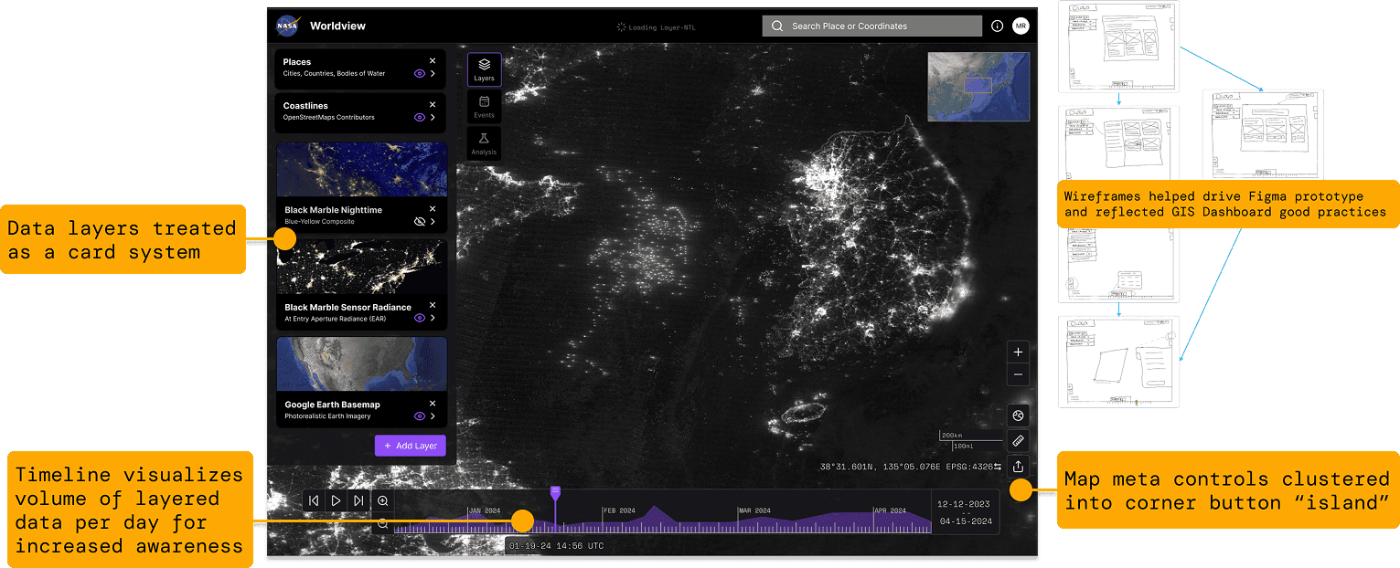 The redesigned Worldview UI was driven by established GIS layout good practices. "Floating islands" containerize fundamental GIS tools like navigation controls, keeping them accessible without competing with the map canvas for attention. The design is compliant with NASA's Stellar Design System and Brand Guidelines, grounding the prototype in the enterprise ecosystem it would actually live in.